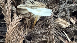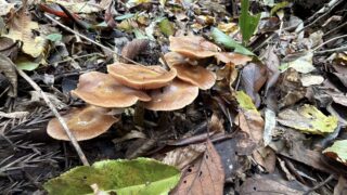 タマバリタケ科 ナラタケ 傘:濡れていて分かりづらいが、中央にササクレ、縁のほうは条線がある。ヒダ:白に近い薄褐色柄:上部にツバがあり、下部に向けて色が濃くなる。中空。発生環境:広葉樹の枯れ木や埋れ木。黄色タイプ 2025.10.27 タマバリタケ科